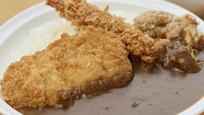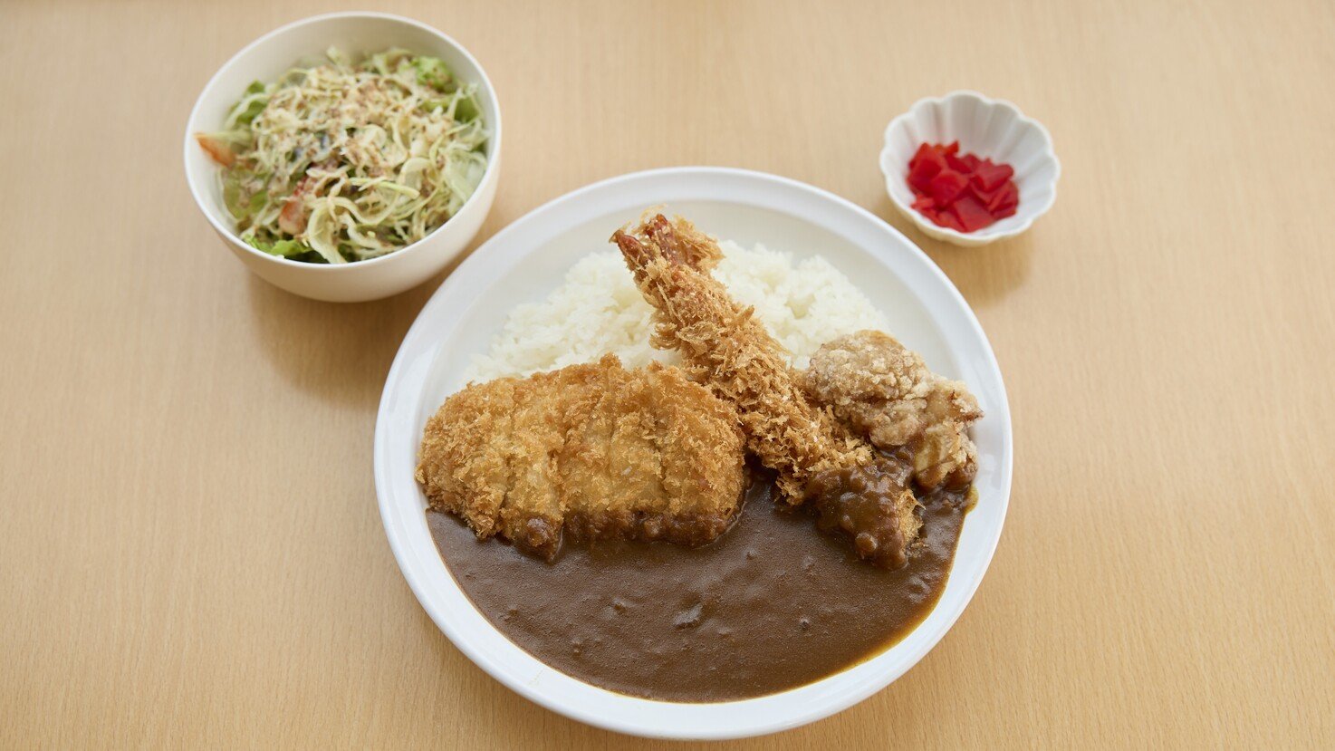 カレーライスの上にはロースかつ・エビフライ・唐揚げ!まるでみんなの夢がつまったようなカレーライスを、SAで楽しむことができます。