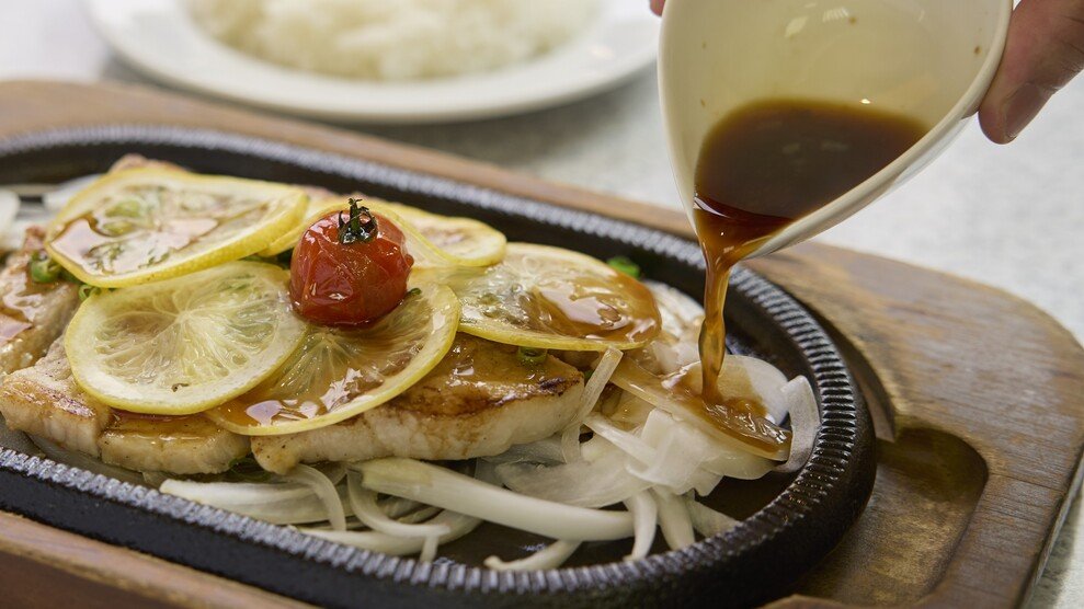 レモンステーキとは、レモン果汁を加えた和風ソースをお肉の上にかけて食べるさっぱり味のステーキ。熱々の鉄板で焼き上げたお肉の上にソースをかけると、爽やかな酸味がお肉の旨みをグッと引き立てます。甘みたっぷりの玉ねぎとの相性も抜群です。