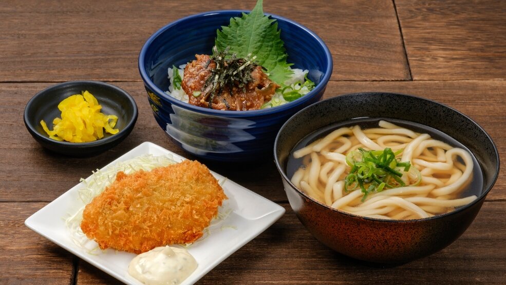 長崎県近海でとれたブランド魚【旬さば】・【旬あじ】を使用した、博多ゴマさば丼のハーフサイズとアジフライをご堪能いただける逸品。あごだしスープの博多のうどんもついてます。