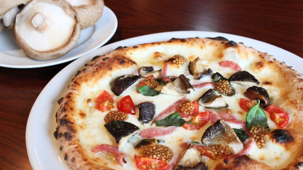 チーズベースの生地に、大分県産のジャンボ椎茸とかぼすウインナーをトッピングしたピッツァ。オーダーを受けてから生地を伸ばし、特注のピッツァ窯で焼き上げるナポリピッツァは格別です。